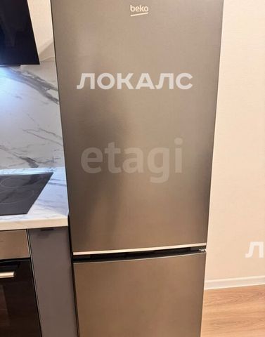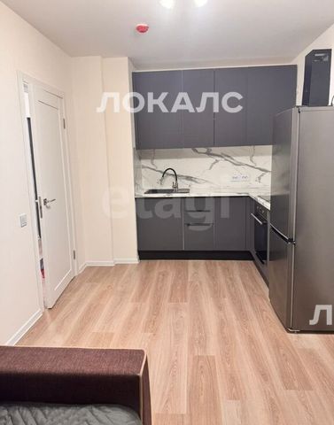 Объект отличается рациональной планировкой, объединяющей кухню и гостиную в единое комфортное пространство, что оптимально для одного человека или пары. Вся необходимая бытовая техника и мебель присутствуют: электрическая плита, холодильник, стиральная машина, кухонный гарнитур со столом, диван, кровать и функциональный шкаф для хранения.