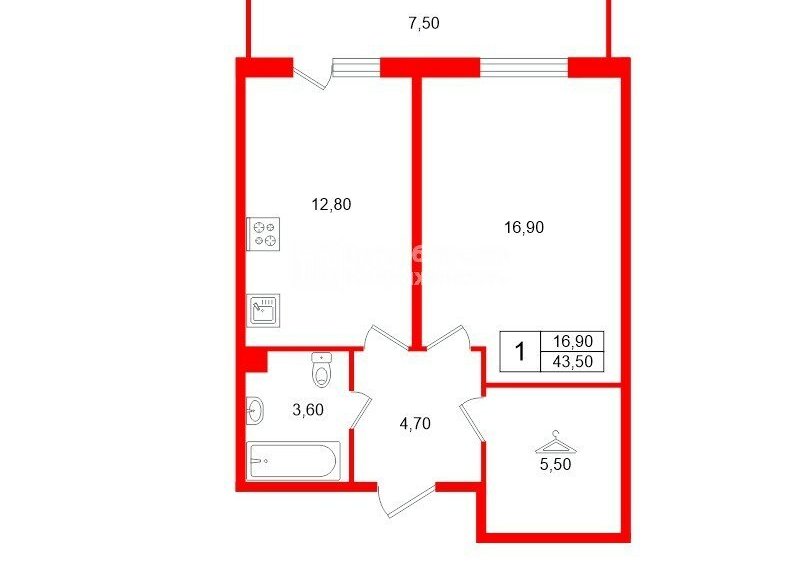 1-комнатная квартира: Санкт-Петербург, Парашютная улица, 36к1 (43.5 м²)