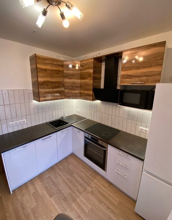 Кухня: Установлен гарнитур, бытовая техника (варочная панель, духовой шкаф, холодильник).