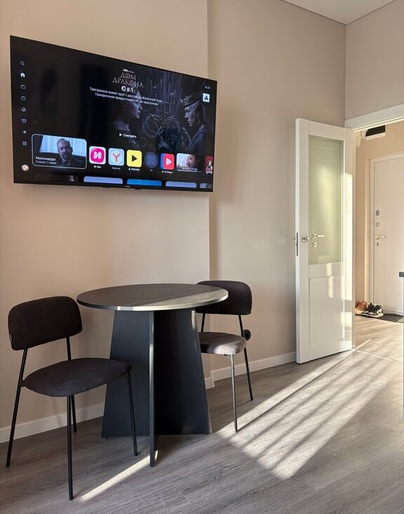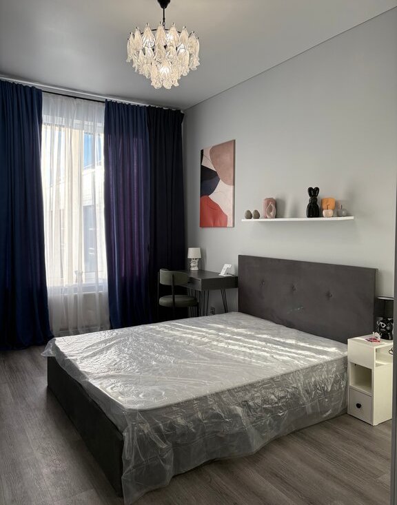 Кухня : встроенный холодильник, микроволновая печь и посудомоечная машина, тв 55 дюймов, кофемашина, алиса. В спальне: рабочий стол, кровать 160*200. Большой шкаф в прихожей и спальне.