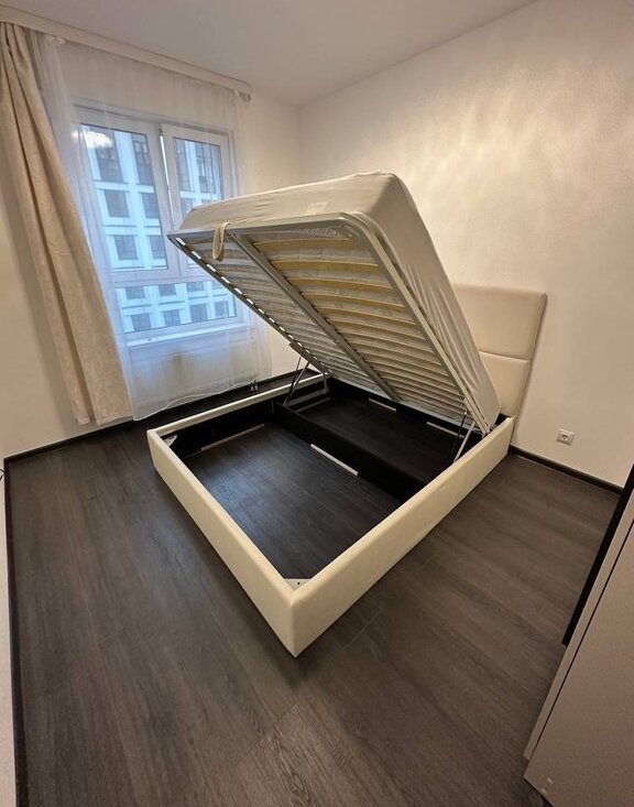 В комнате вместительный шкаф, двухспальная кровать с подъемным механизмом.