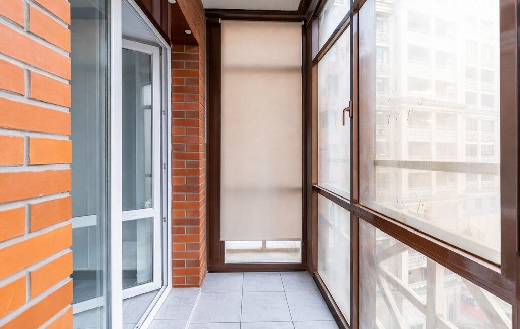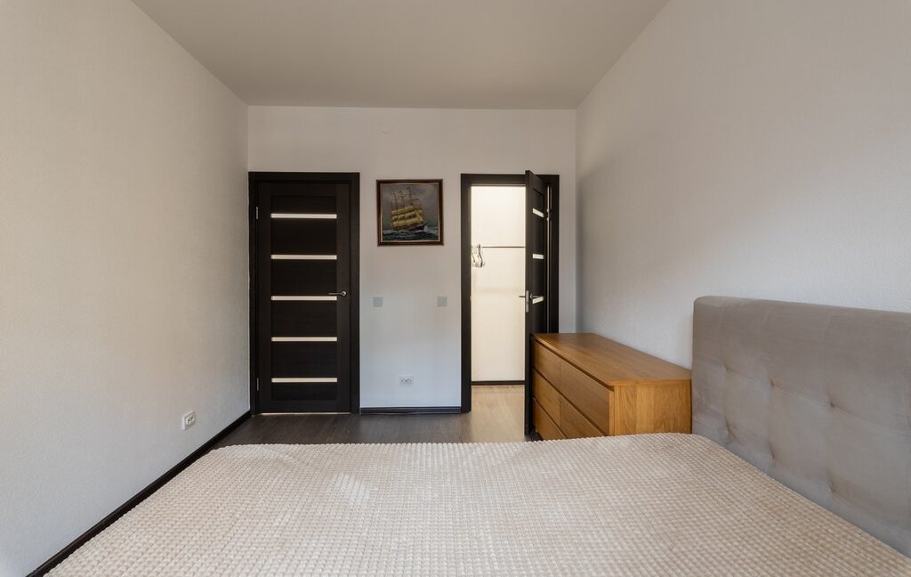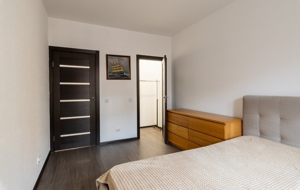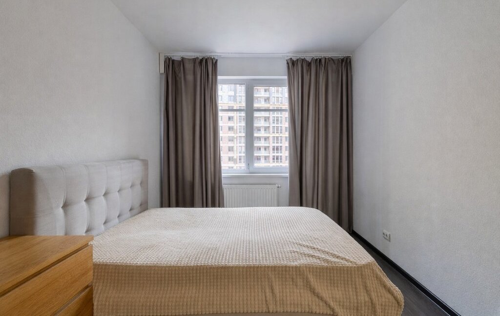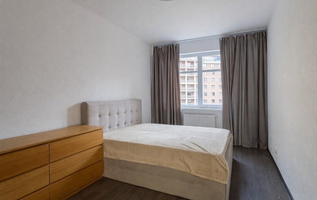 Квартира после ремонта. Большая удобная кровать, гардеробная, просторный балкон. Вид на закрытый двор с ландшафтным дизайном.