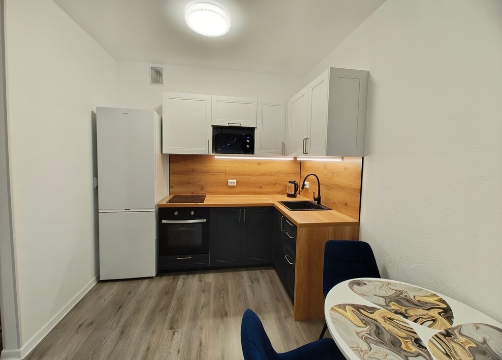 Кухня оборудована всем необходимым: холодильник, микроволновая печь, варочная панель и духовой шкаф. Есть обеденный стол и стулья, диван, ТВ с WI-FI