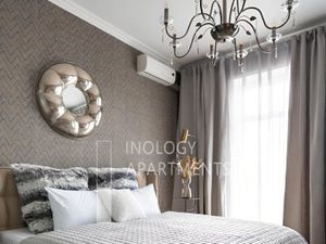 Уютная спальня с большой кроватью и рабочим местом, с просторной гардеробной и выходом на балкон, откуда открывается вид на крыши города. Совмещенный санузел с душевой кабиной. Светлая кухня со встроенной техникой.