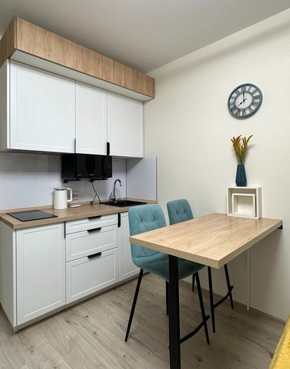 Светлая и просторная студия с уникальным дизайном. Полностью укомплектована и готова к заселению! Особенности: • Свежий современный ремонт • Окна с легкими шторами — много естественного света • Удобная двуспальная кровать с ортопедическим матрасом • Полностью оборудованная кухня • Вся необходимая бытовая техника • Стильная мебель в светлых тонах • Высокоскоростной Wi-Fi • Телевизор SMART-TV • Рабочая зона со столом