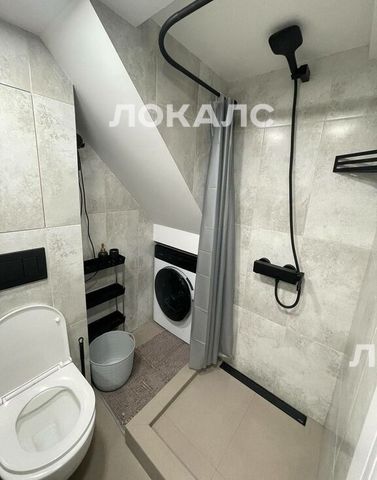 Санузел с душевой кабиной и встроенной стиральной машиной.
