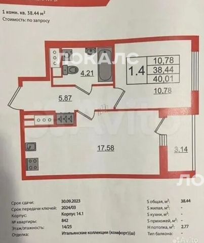 1-комнатная квартира: Санкт-Петербург, проспект Авиаконструкторов, 69 (40 м²)