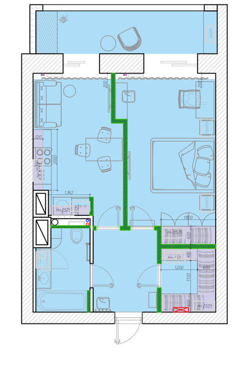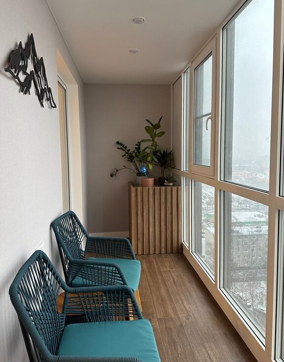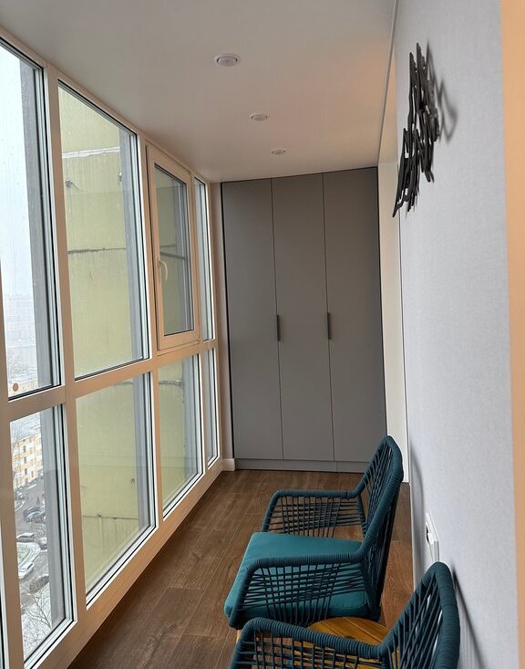- Мебель и текстиль: вся необходимая мебель, в том числе зона отдыха на балконе, постельное бельё, комплекты полотенец, полный набор посуды и кухонных принадлежностей.