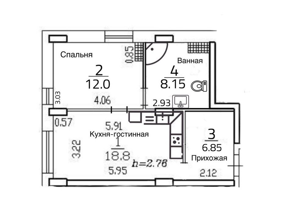 • высота потолков: 2,76м;