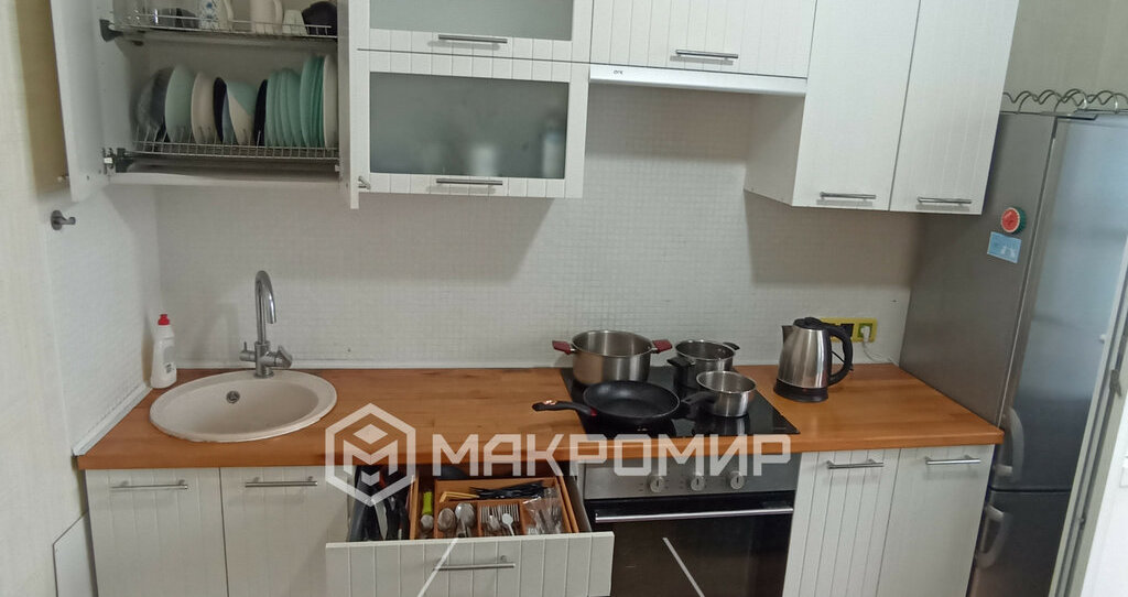 Кухня с индукционной плитой, кастрюли, сковороды, и вся необходимая посуда есть.