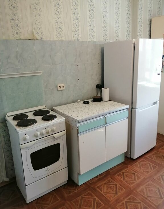 Есть кухонная мебель с новым холодильником, мебель в комнате, новый диван.