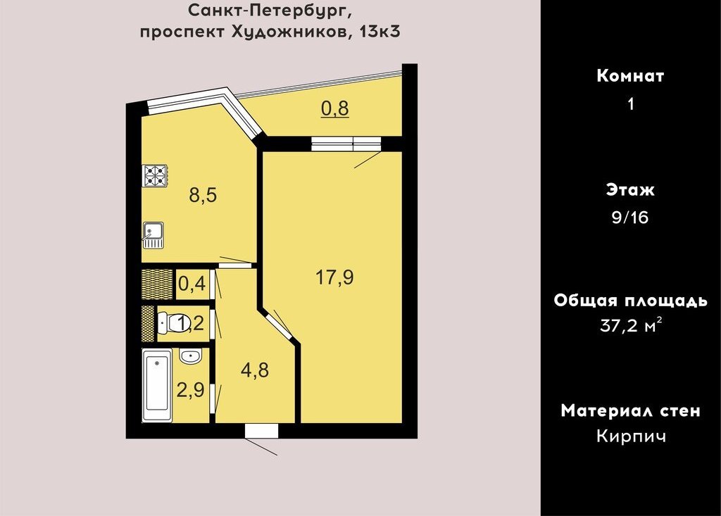 1-комнатная квартира: Санкт-Петербург, проспект Художников, 13к3 (37.2 м²)