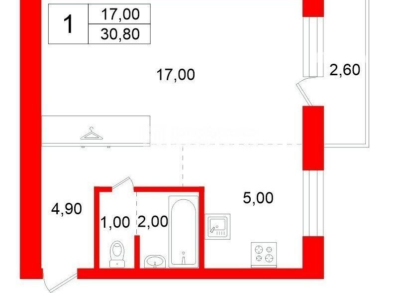 Общая площадь квартиры — 30,8 м?. Есть балкон.