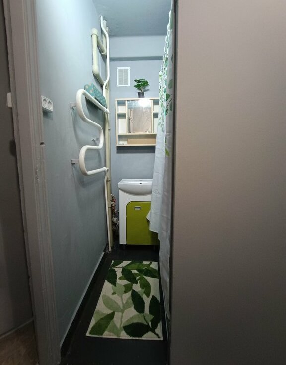 В квартире раздельный санузел, кухня (8,1 кв.м), в коридоре встроенный шкаф. Комната 15,6 кв.м. Окна (комната и кухня) выходят на дорогу.