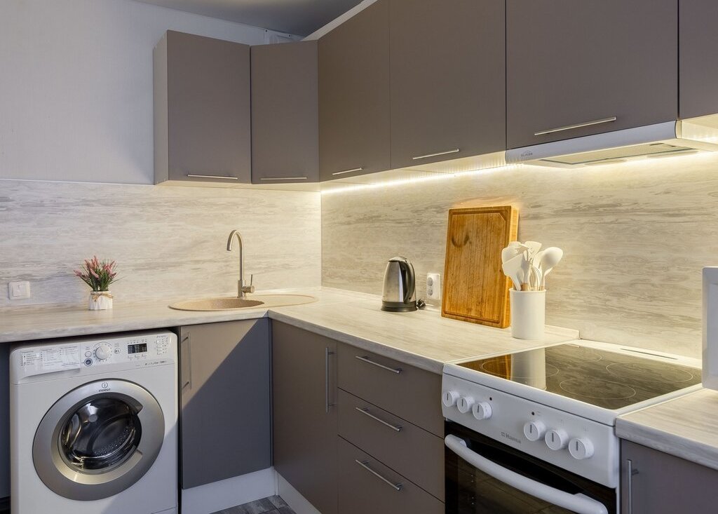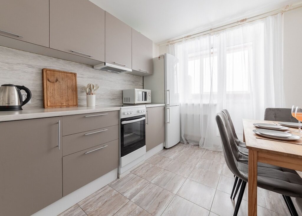 ✅полноценной кухней со всем необходимым для приготовления любимых блюд ( посуда, чайник, микроволновка, духовой шкаф и варочная панель).