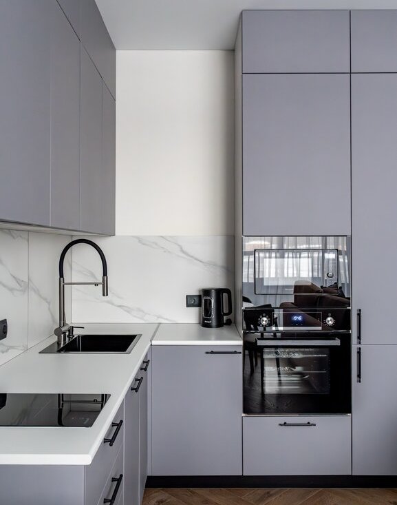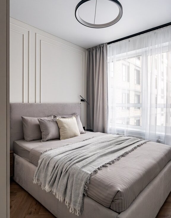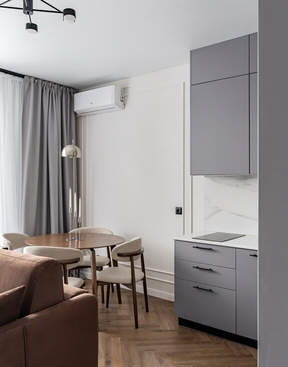 Дизайнерский ремонт в спокойных, серых тонах, балкон. Есть все необходимое оборудование и мебель.
