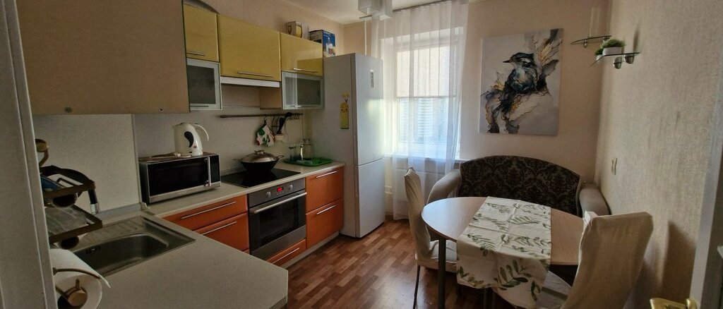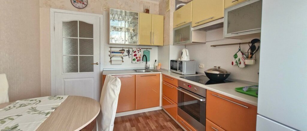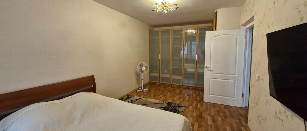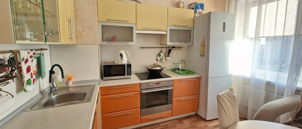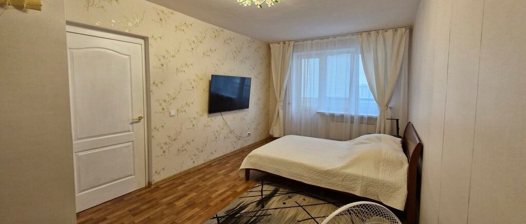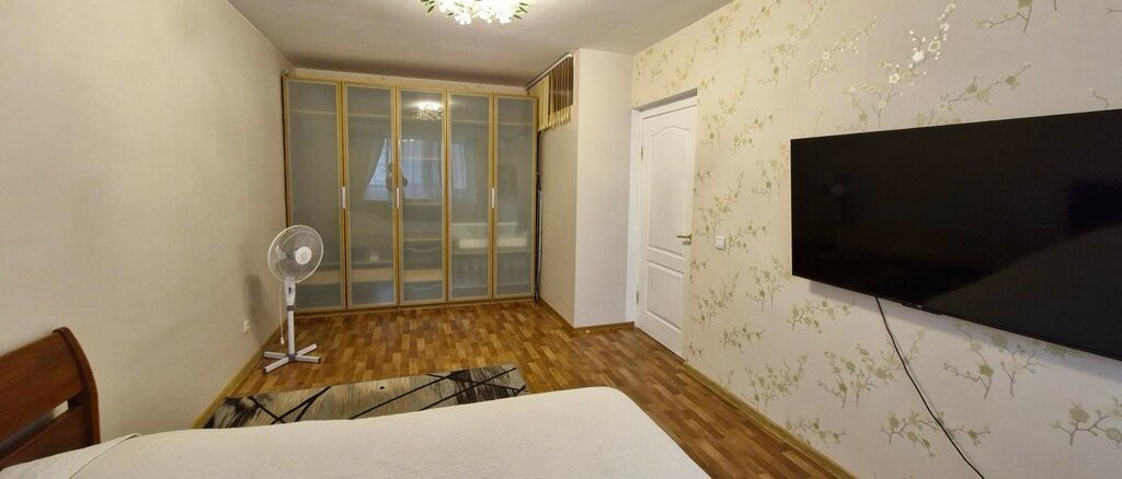 В квартире выполнен косметический ремонт. Просторная кухня оборудована необходимой техникой, включая холодильник и микроволновую печь, соковыжималку. В спальне установлен телевизор, вентилятор, шкаф. Есть утюг, гладильная доска, сушилка для белья.В коридоре шкаф-купе.