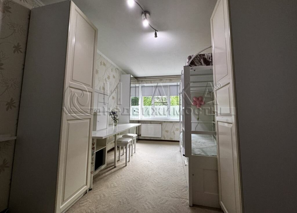 Жилая комната грамотно зонирована: предусмотрены двуспальная кровать, дополнительная спальная зона с двухъярусной кроватью, удобное рабочее место и продуманная система хранения. Комната светлая, с окном во двор.