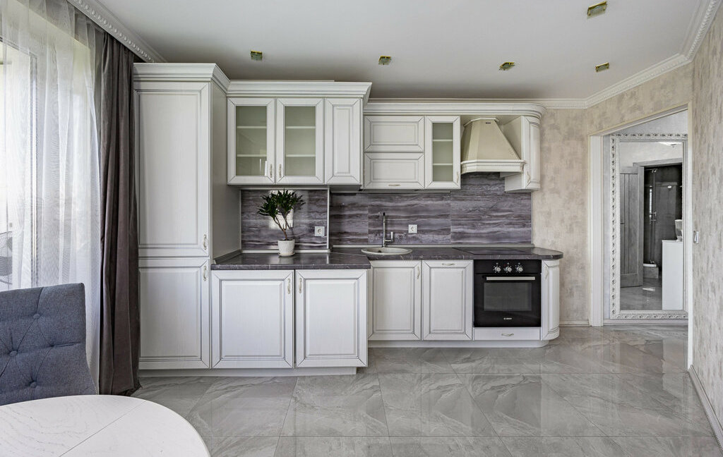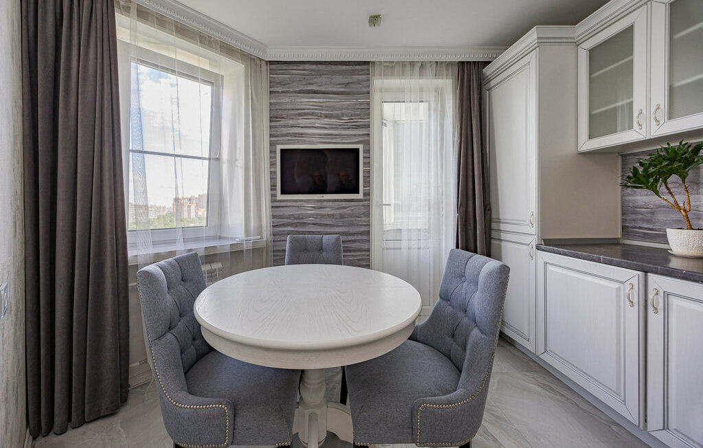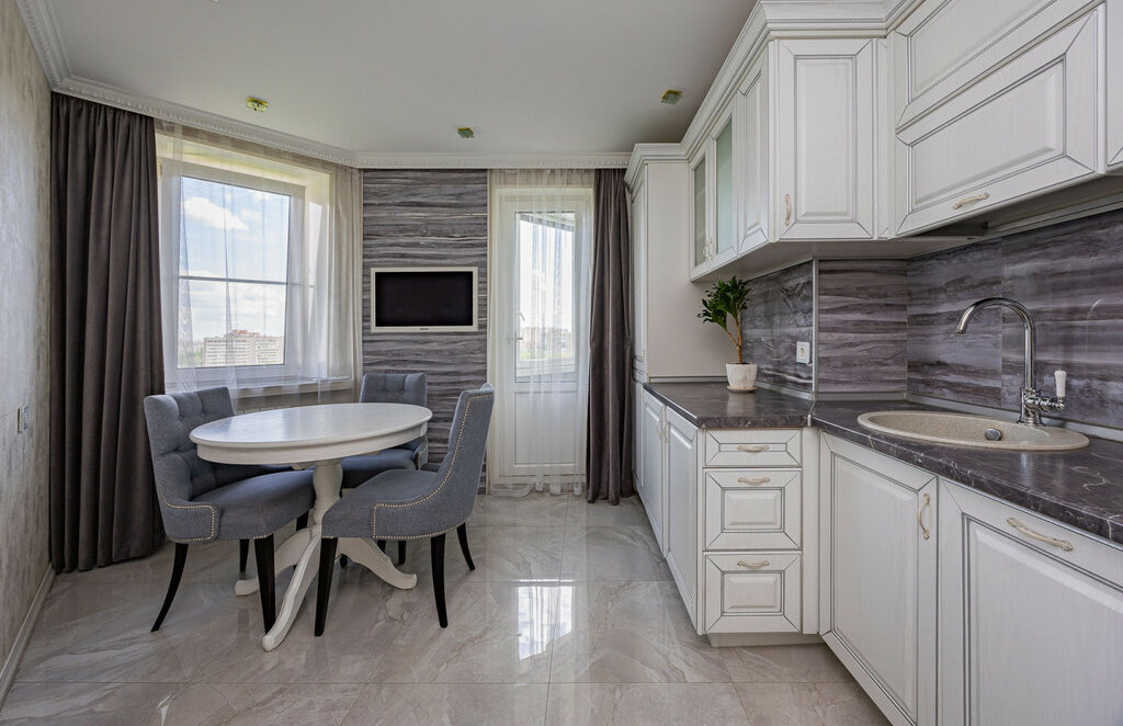 Кухня оборудована всей необходимой бытовой техникой.