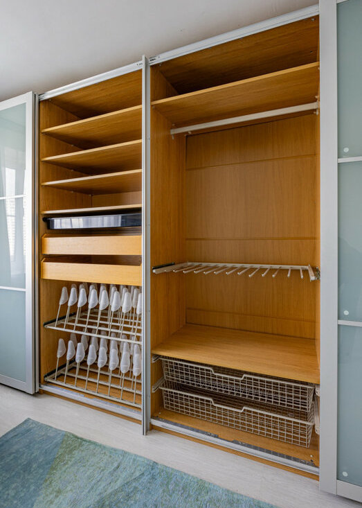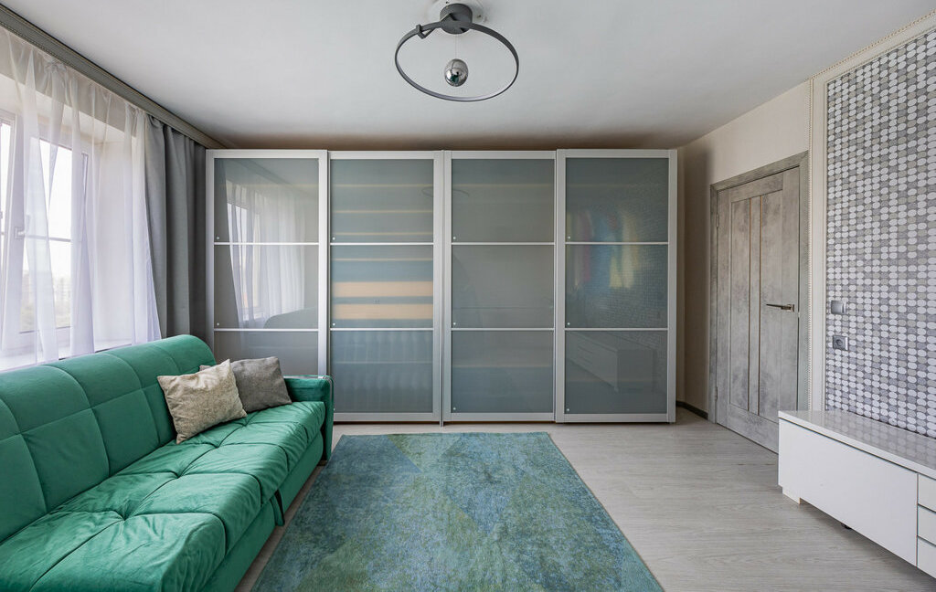 Просторная комната, где установлен вместительный шкаф-купе. Есть кондиционер.