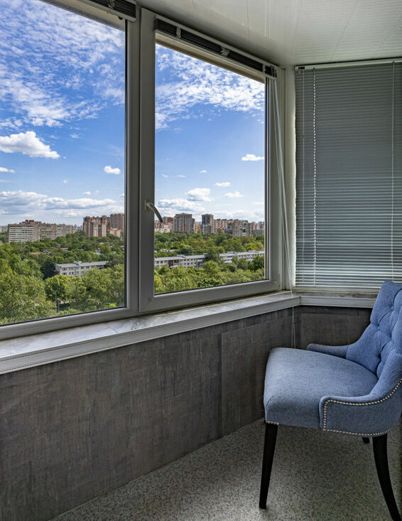 Застекленная лоджия с местами хранения, откуда открывается панорамный вид на город.
