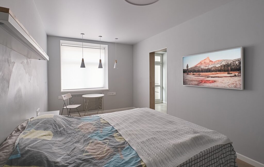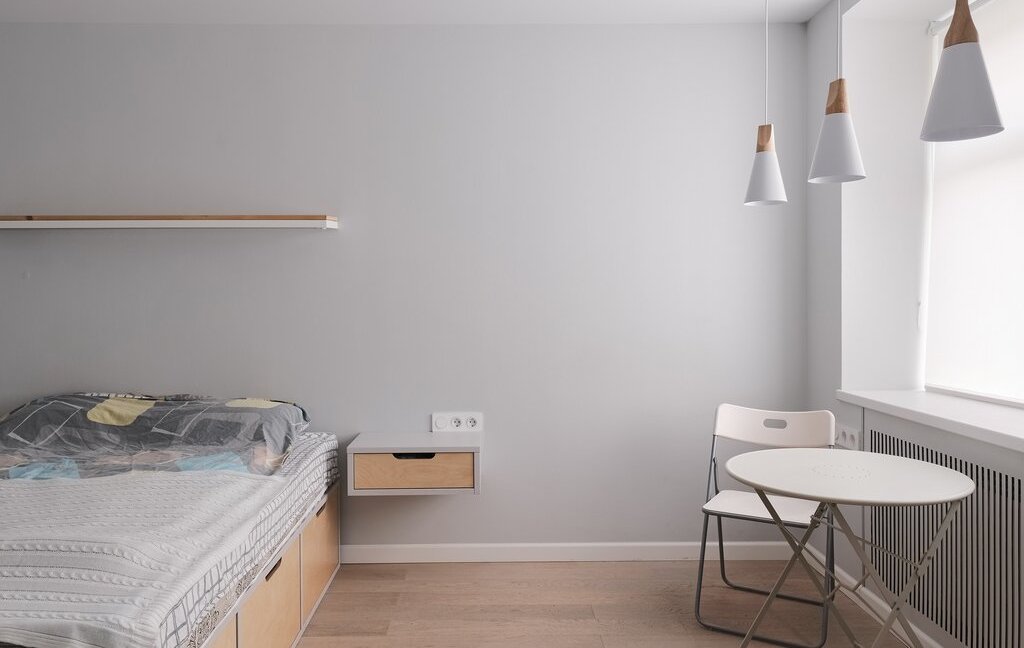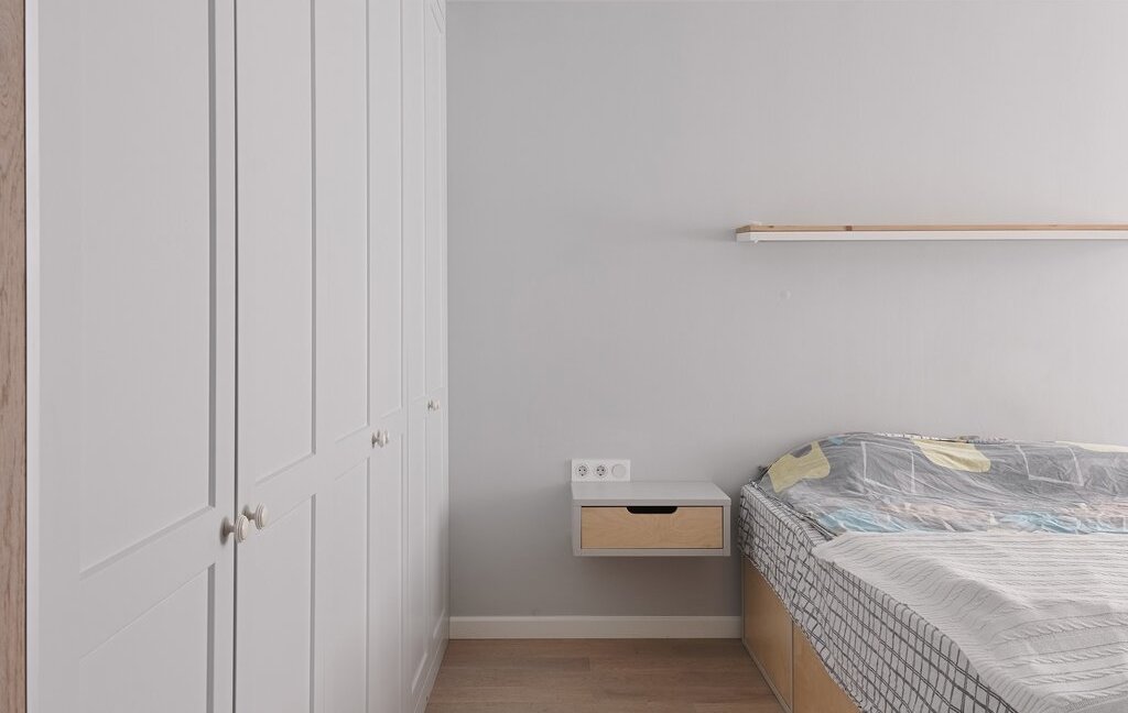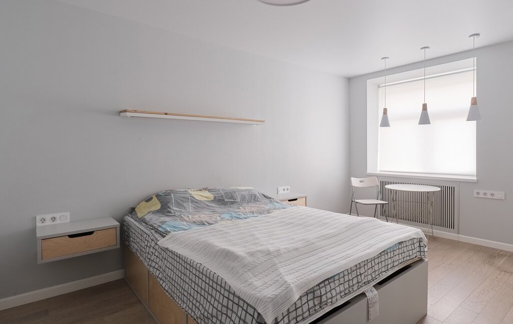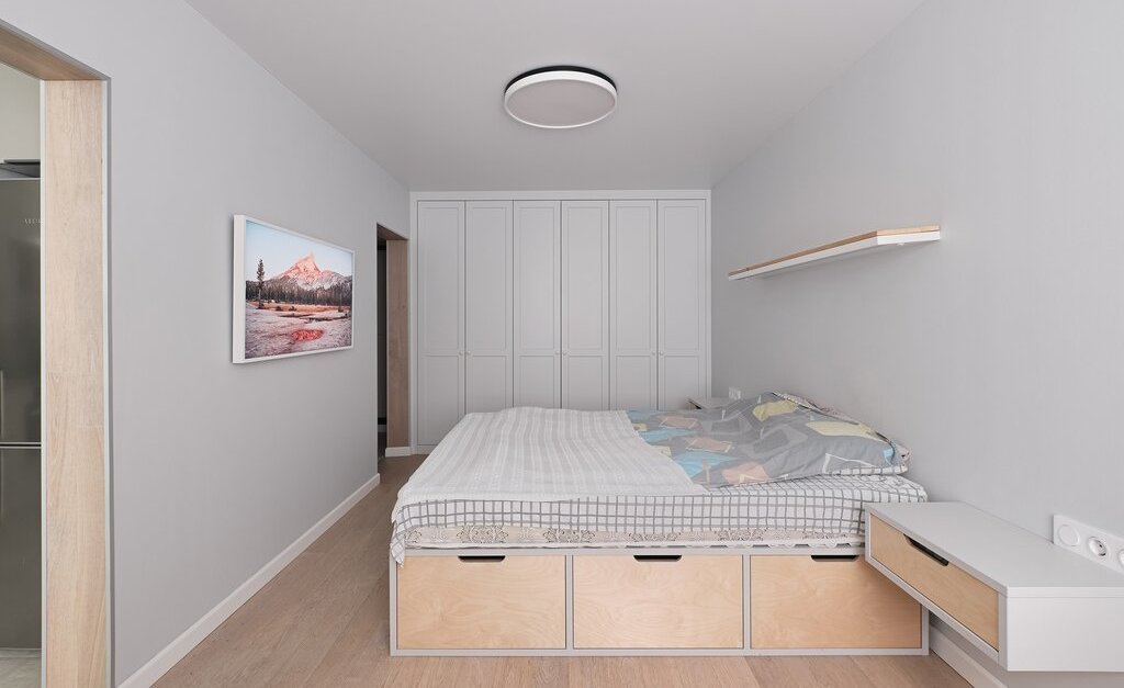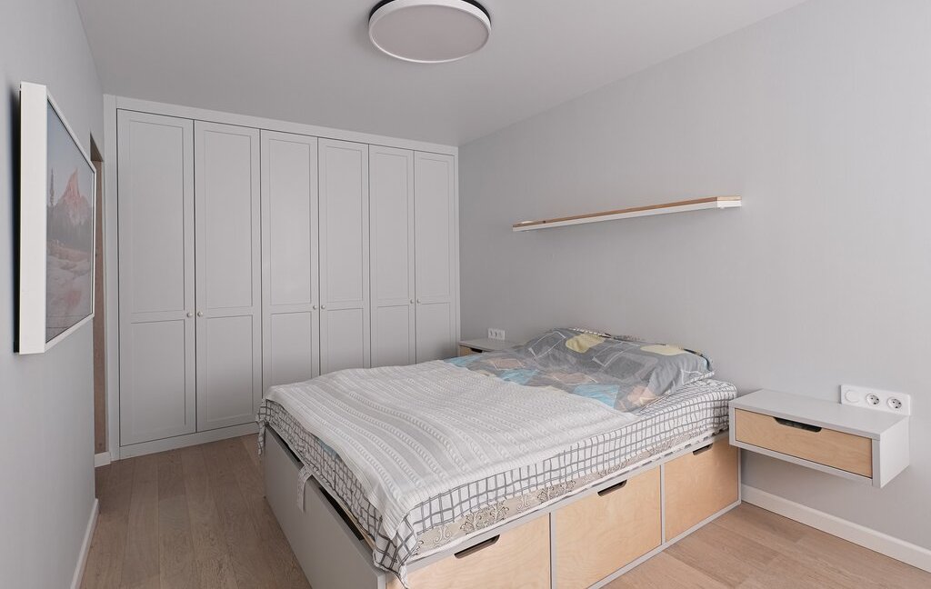 - Много мест для хранения (огромный шкаф-купе в прихожей, трёхсекционный шкаф в жилой комнате, 6 выдвижных ящиков в кровати);