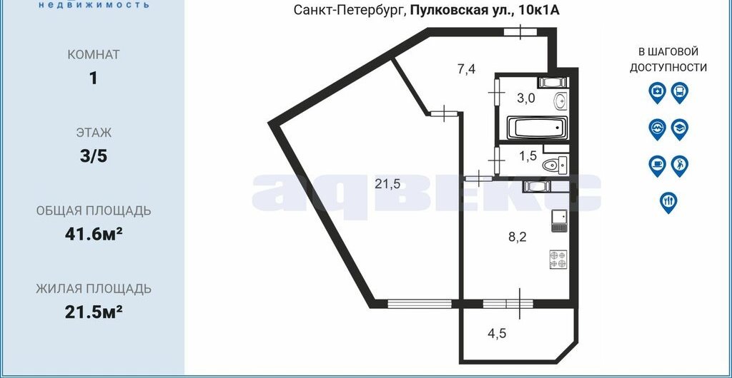 1-комнатная квартира: Санкт-Петербург, Пулковская улица, 10к1 (41.6 м²)