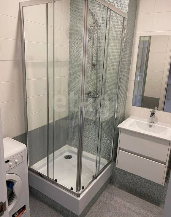 Совмещенный санузел с душевой кабиной и стиральной машиной.