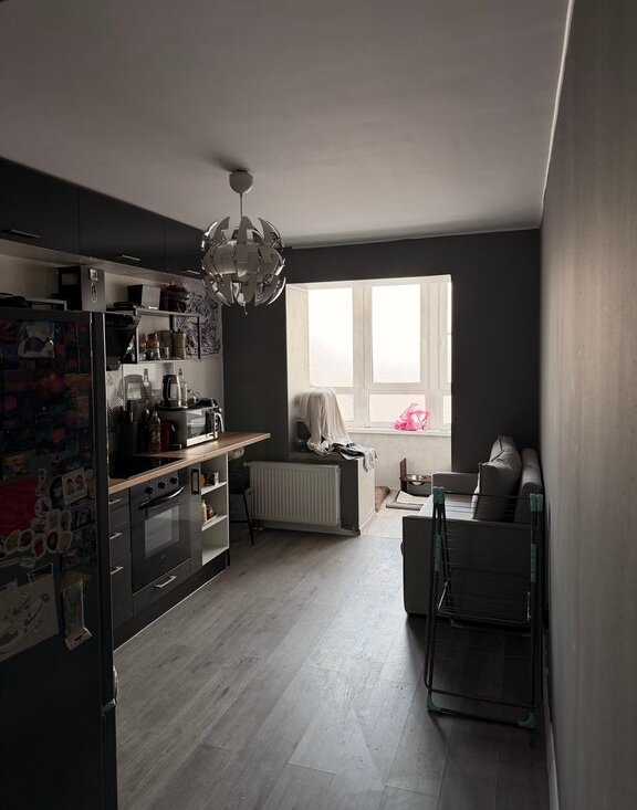 В квартире выполнен дизайнерский ремонт с тщательно подобранной мебелью и современной техникой. На кухне и в комнате есть вся необходимая мебель, а также холодильник, телевизор 75 дюймов и стиральная машина с функцией сушки. Санузел совмещенный, оборудован ванной. Балкон утеплен и совмещен с кухней, что делает кухню не 17, в все 22 метра. На кухне есть доп. спальное место.