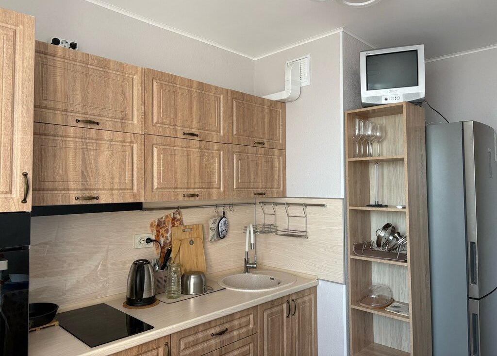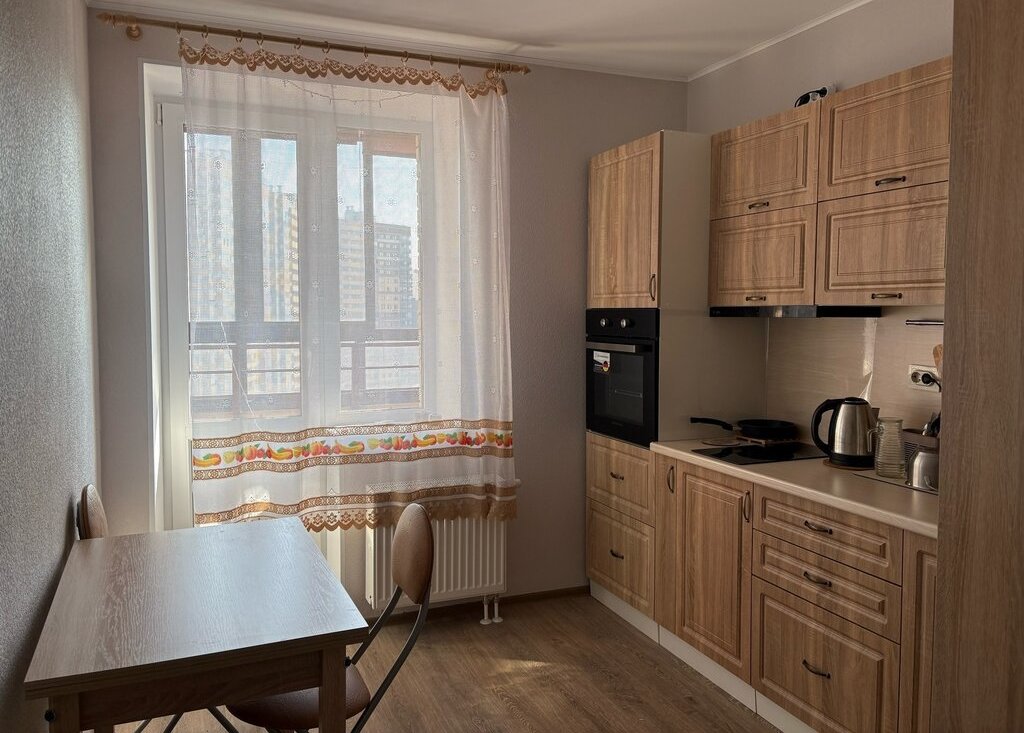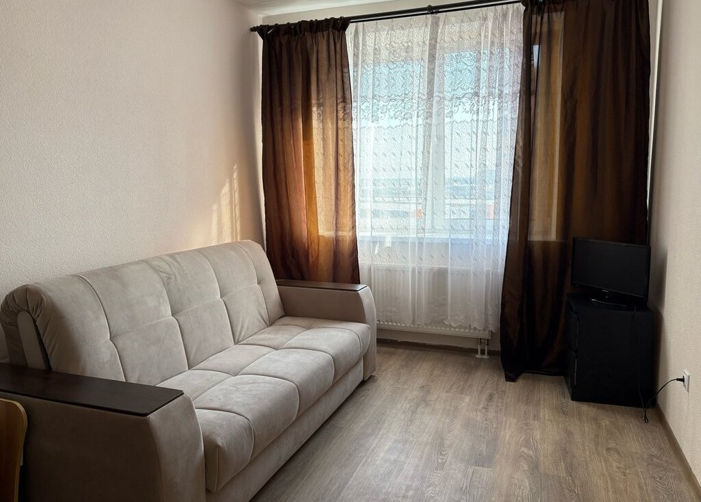 Светлая квартира с мебелью и современной техникой (холодильник, стиральная машина, духовка, СВЧ). Общий метраж - 28,3 м2. Есть гардеробная, застеклённый балкон с утеплённым полом. Заезд с 01.05.