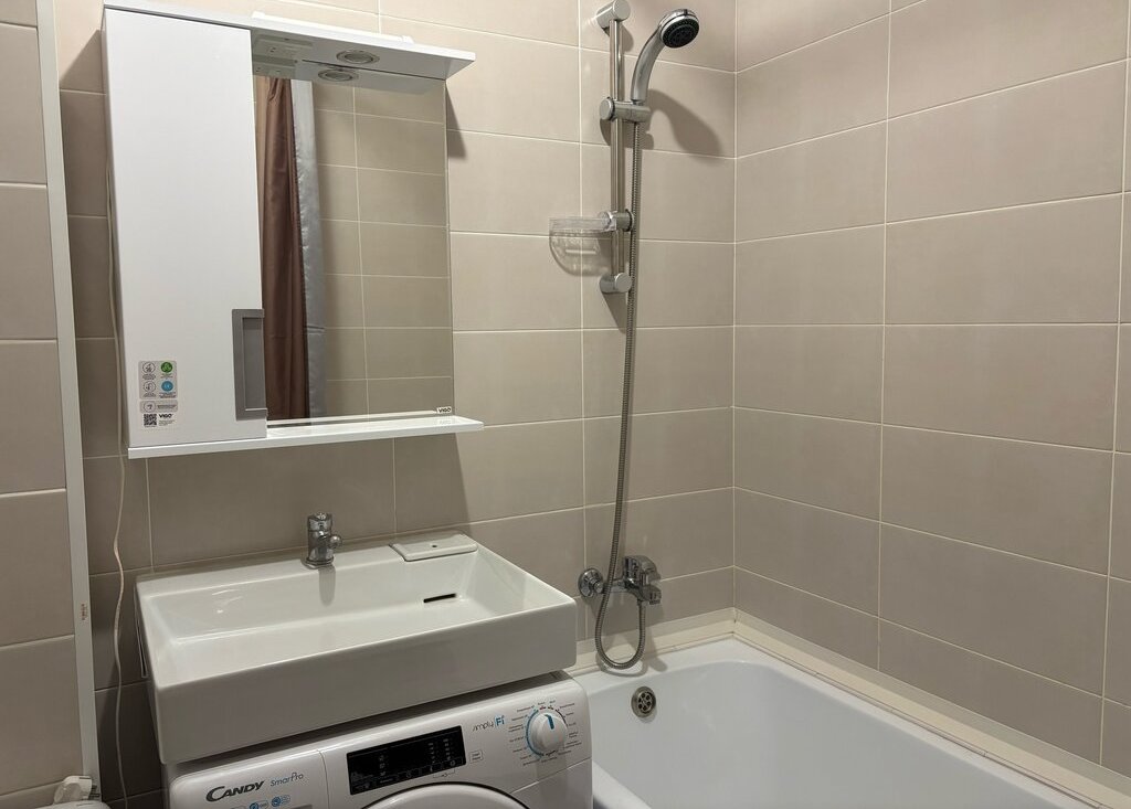 Совмещённый, с ванной. Стиральная машина Candy (под раковиной, не занимает место). Есть место для хранения.