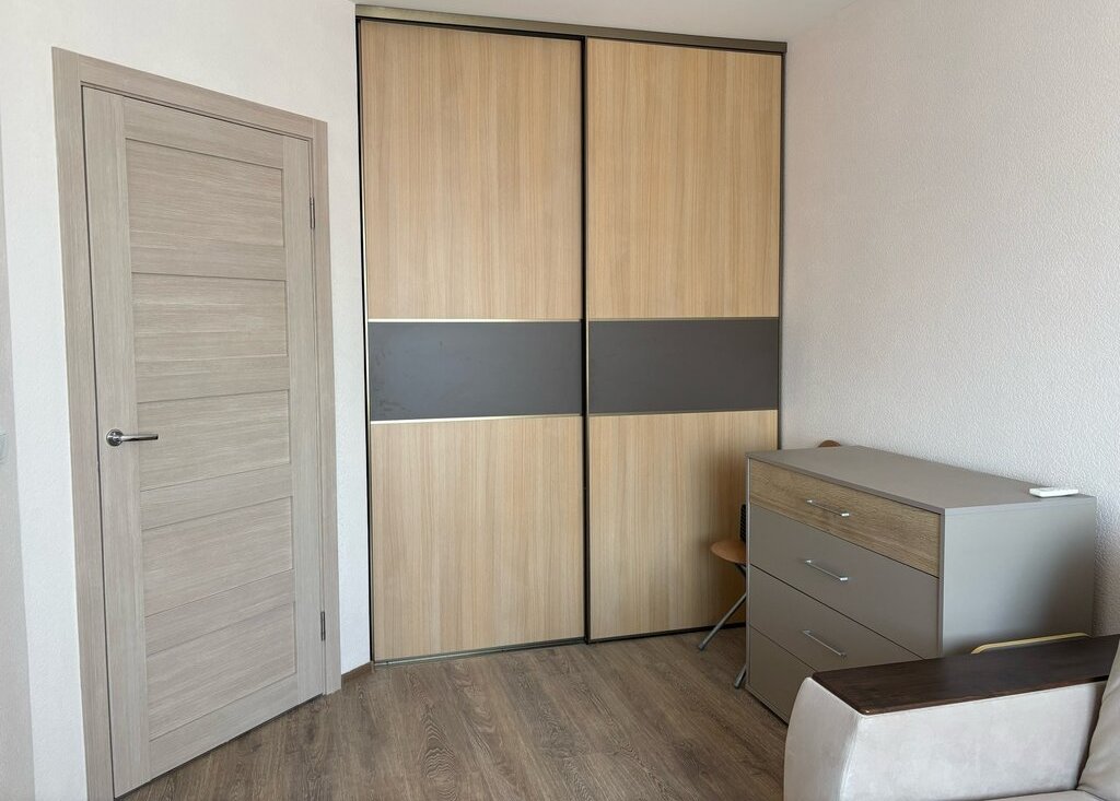 Просторная, светлая. Есть двуспальный диван, комод, а в нише — отдельная гардеробная с хорошей системой хранения.