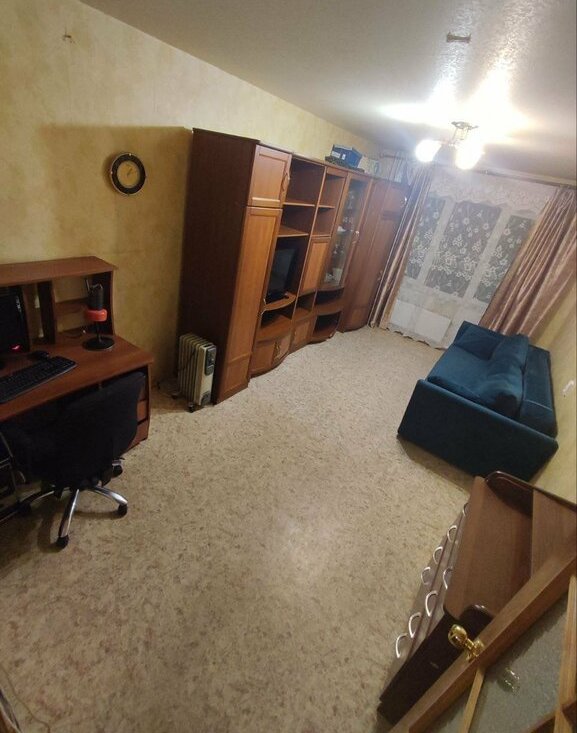 В комнате установлен шкаф и удобный диван, а также имеется рабочий стол с креслом. Из техники в наличии холодильник и стиральная машина. Кухня просторная, оборудована всем необходимым для комфортного приготовления пищи.