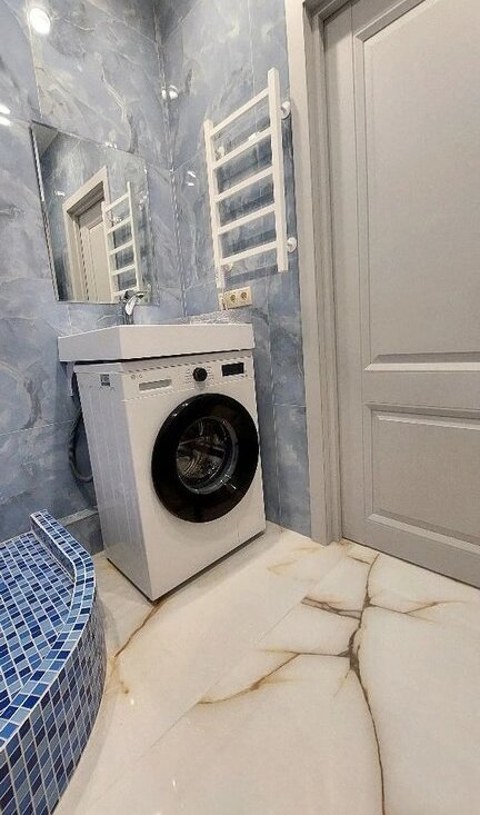 Санузел совмещённый, оформлен в стильном голубом цвете, оснащён стиральной машиной.