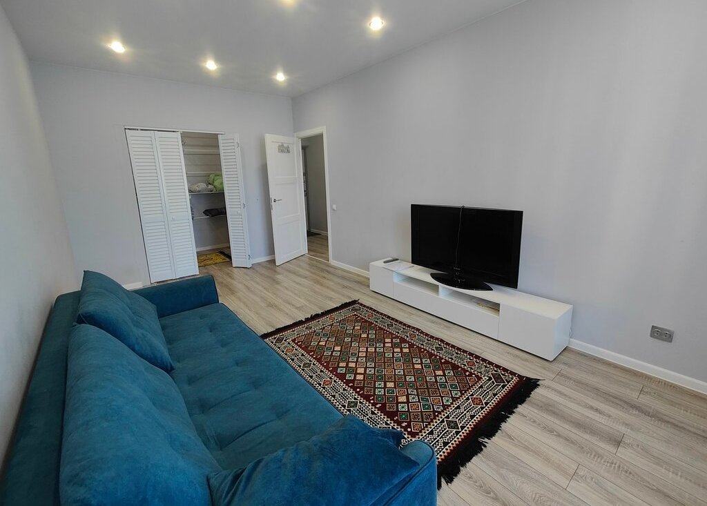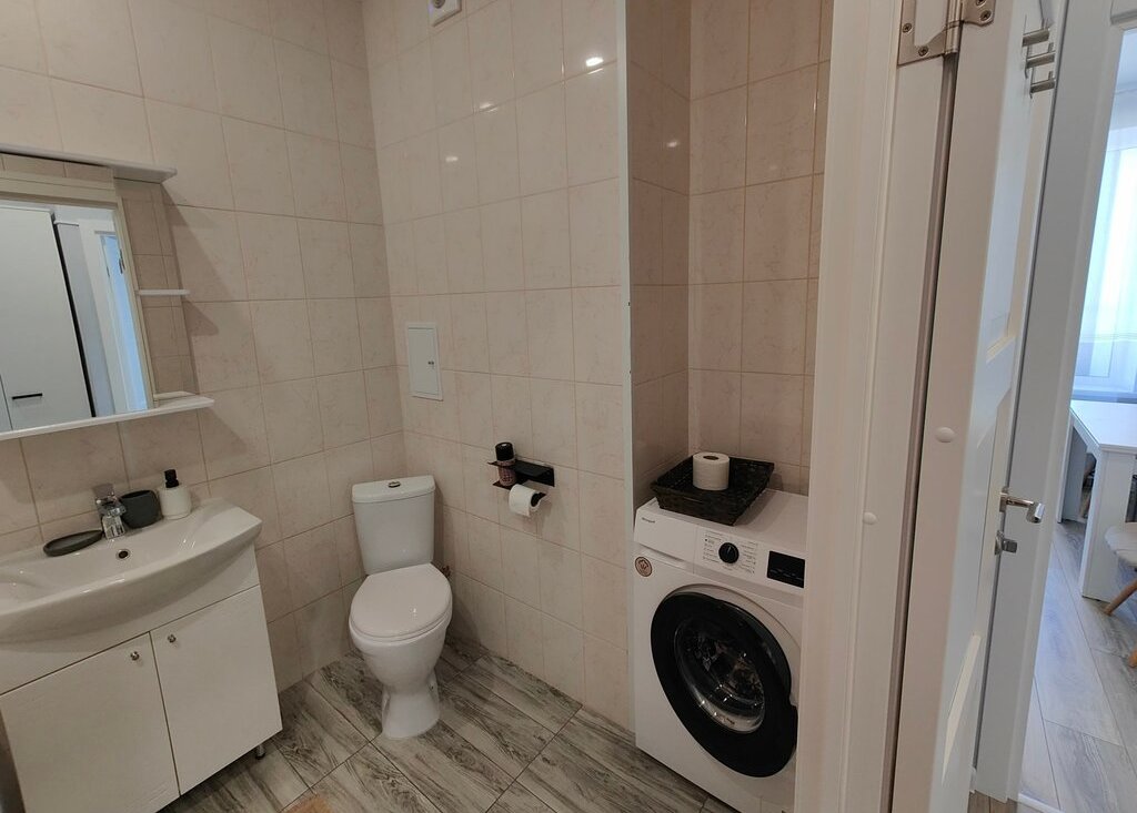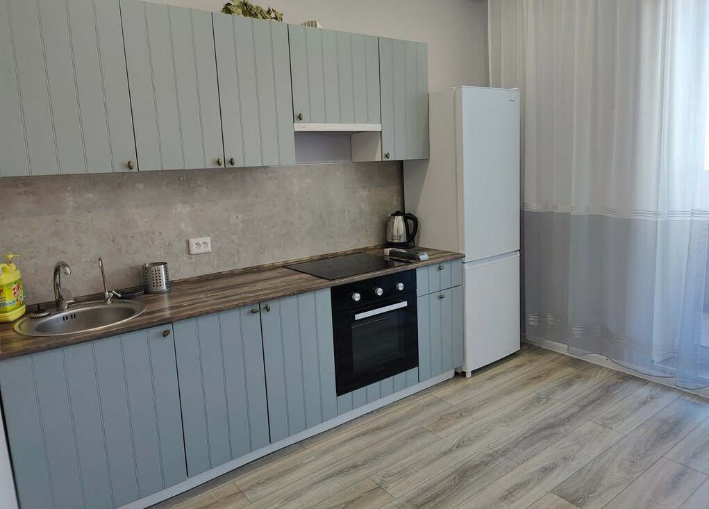 Есть всё необходимое: удобный раскладывающийся диван, телевизор, большой холодильник, духовка, плита, стиральная машина, огромная гардеробная, куда можно сложить всю свою жизнь.