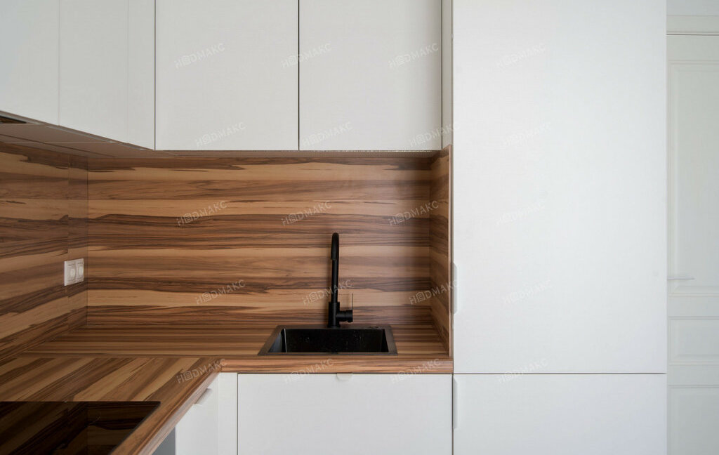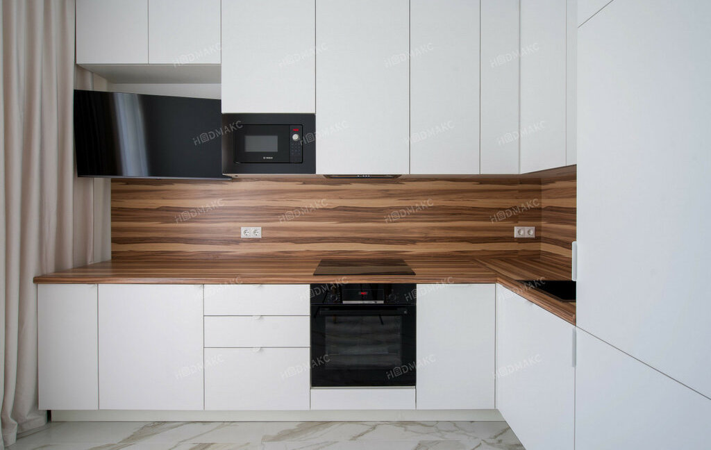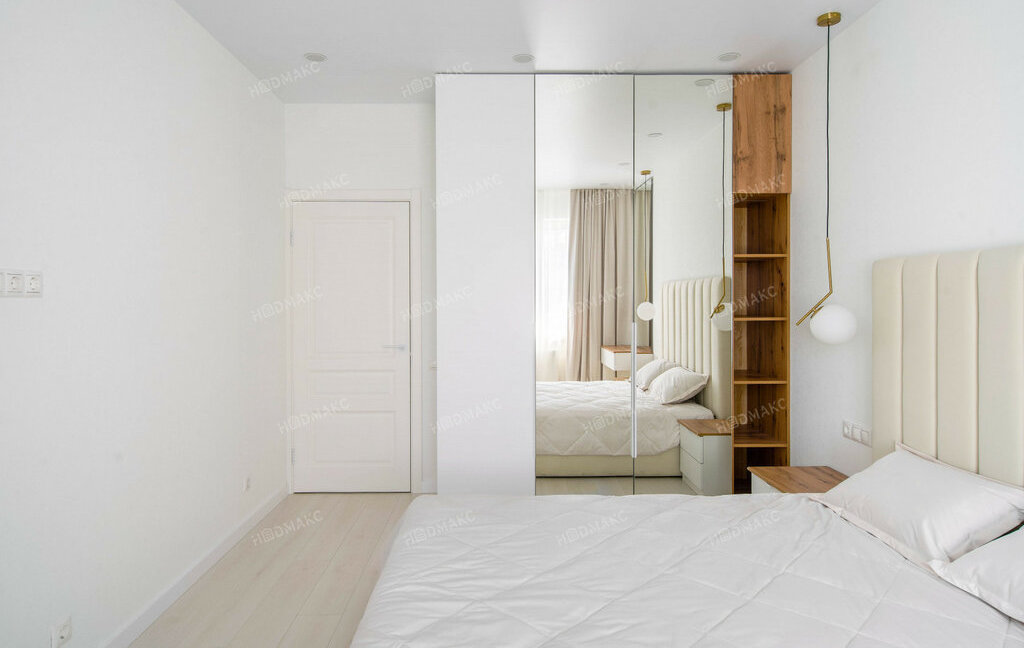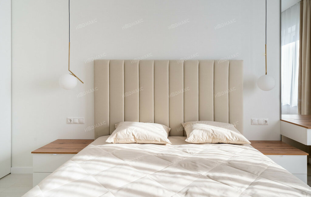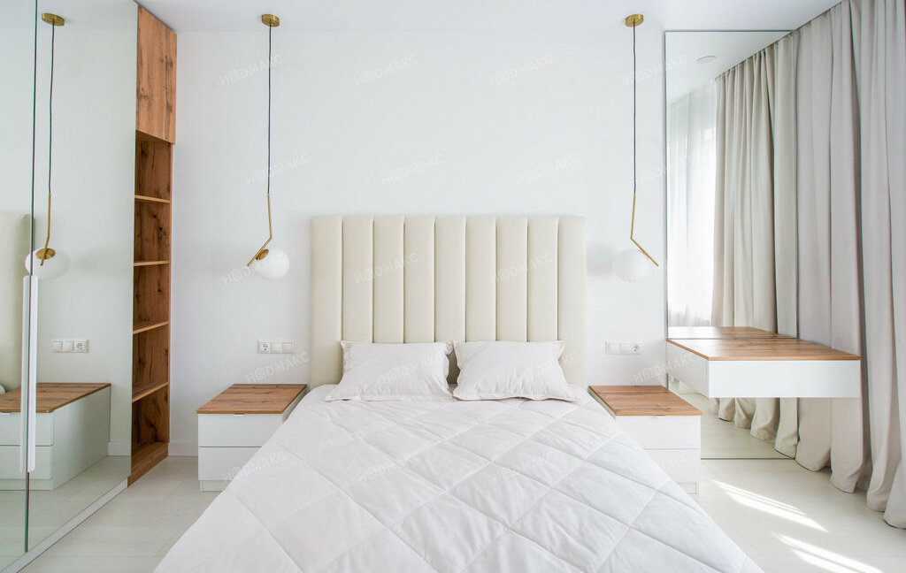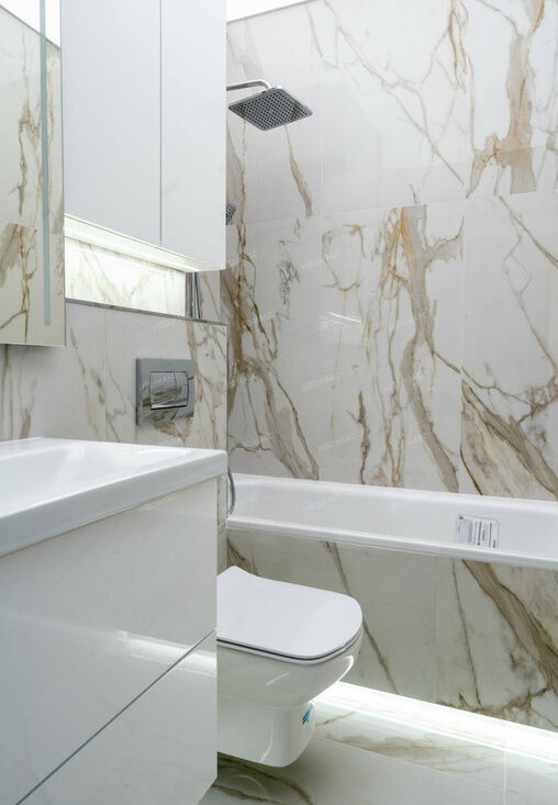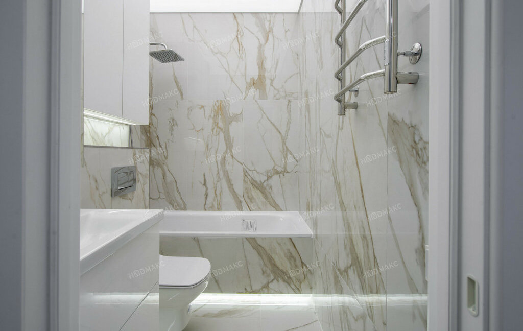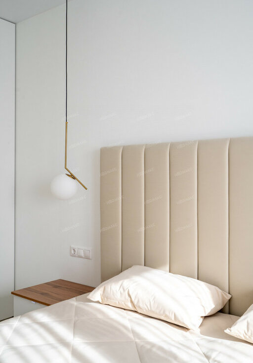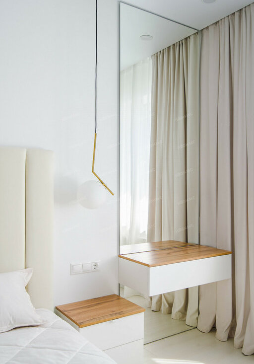 В отделке использовался итальянский керамогранит AtlasConcorde. В коридоре, кухне и ванной установлен теплый пол с управлением по wi-fi. В комнате уложен ламинат. Кровать и матрас 180х200 аскона.