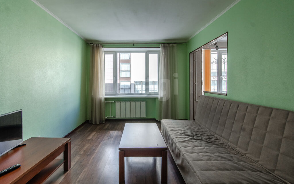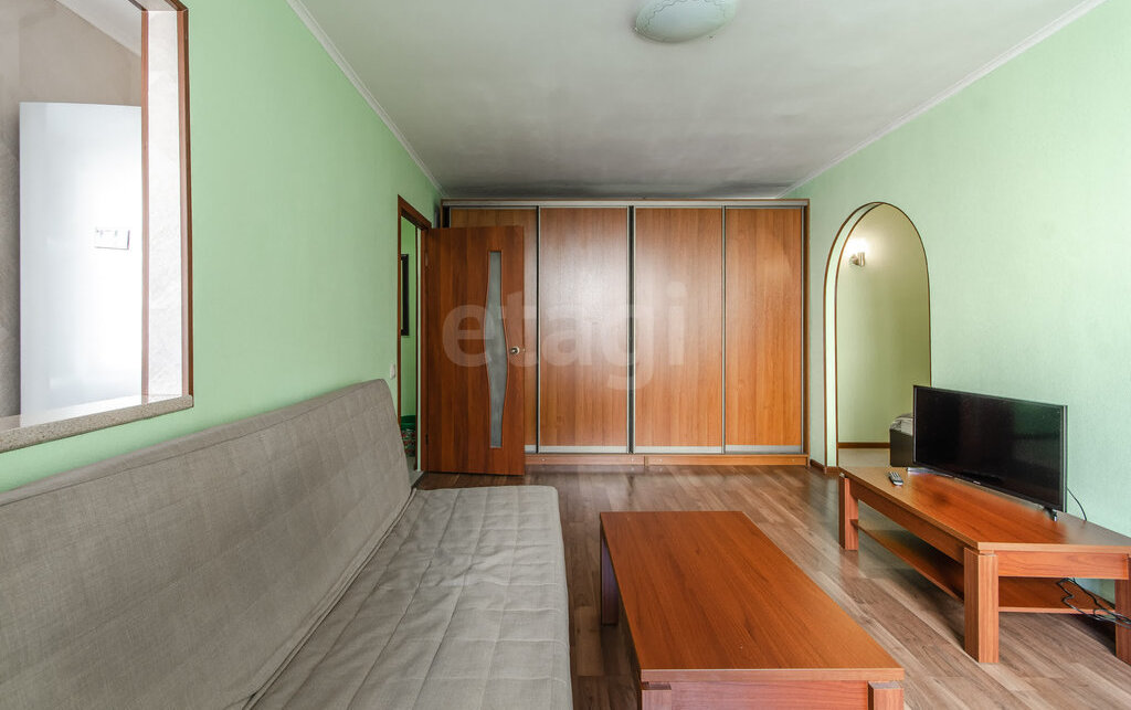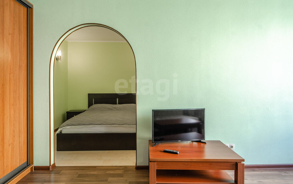 Просторная гостиная с аркой на кухню. Изолированная спальня с большой кроватью.