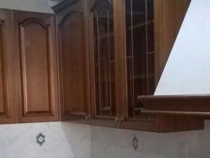 На кухне кухонный гарнитур, электрическая плита, стол, холодильник, чайник, посуда.