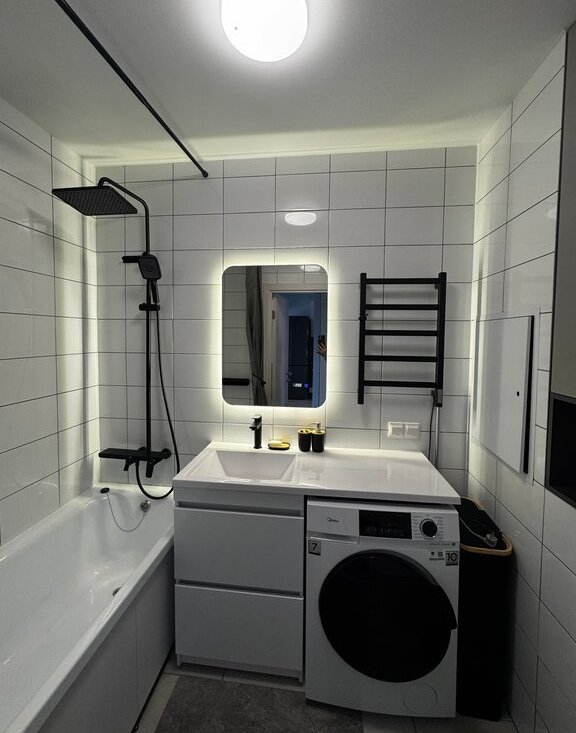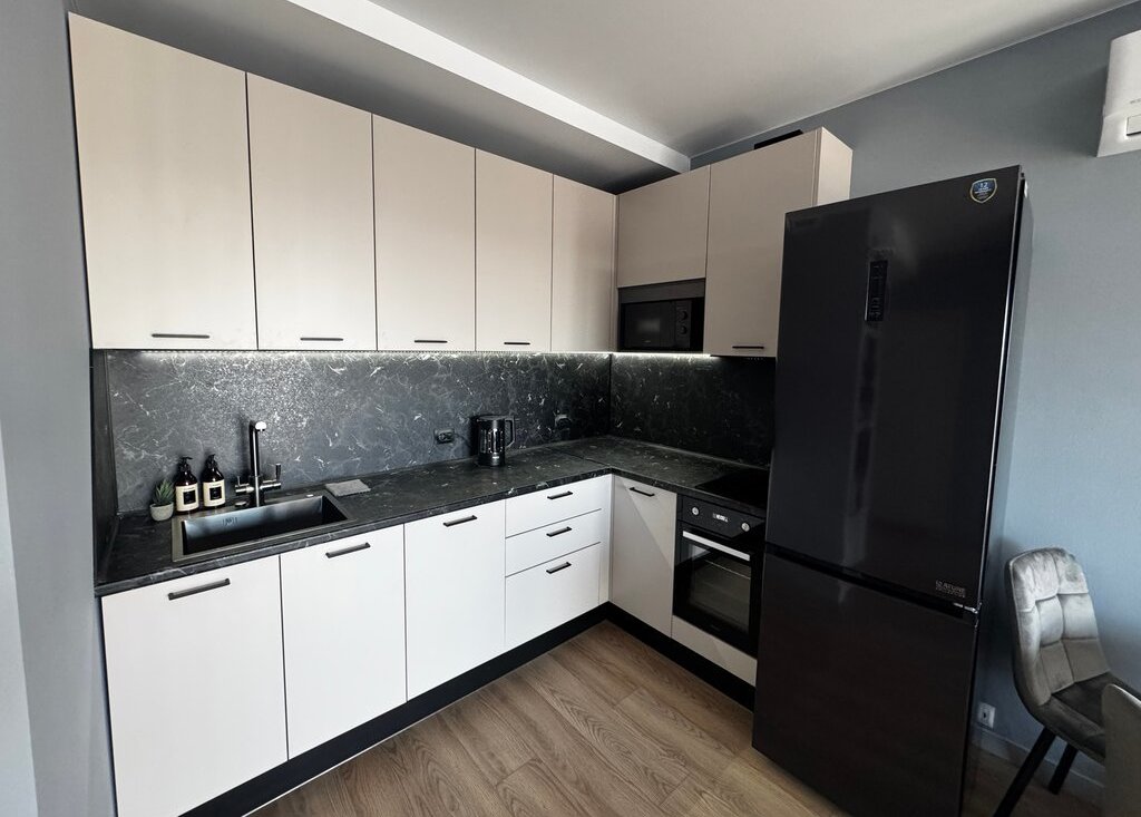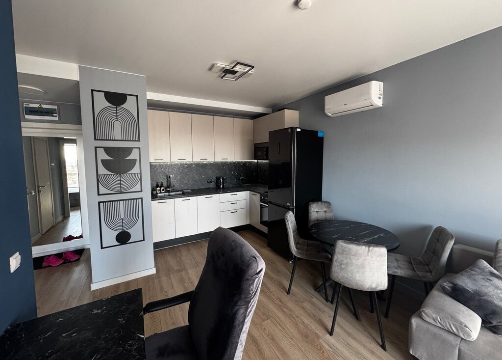 Удобства: в квартире есть посудомойка, духовка двухуровневая, стиральная машина на 7 кг, тропический душ, телевизор 65 дюймов, кондиционер, ортопедический матрас, проведен интернет