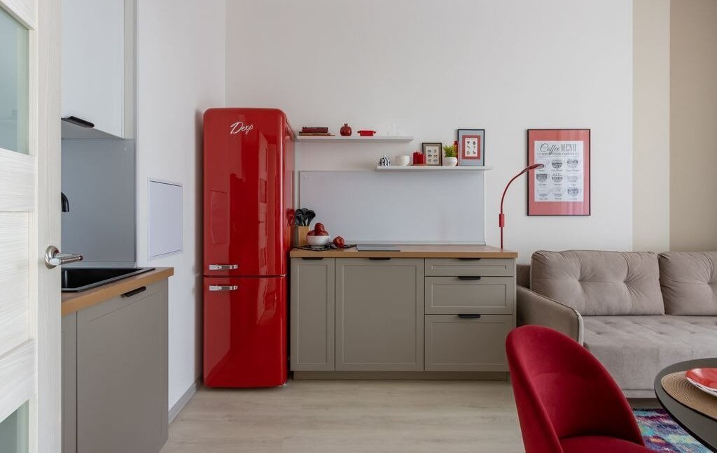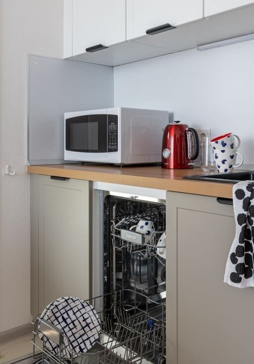 - Бытовая техника: холодильник, микроволновая печь, чайник, утюг, гладильная доска, пылесос, стиральная машина, посудомоечная машина, сушилка для белья,