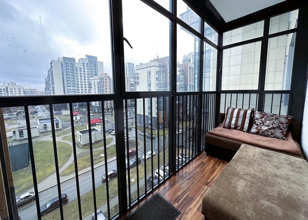 -- Балкон с остеклением до пола, вид на площадку между домами.