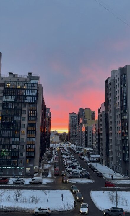 Невероятные рассветы и закаты отражающиеся в окнах домов напротив.