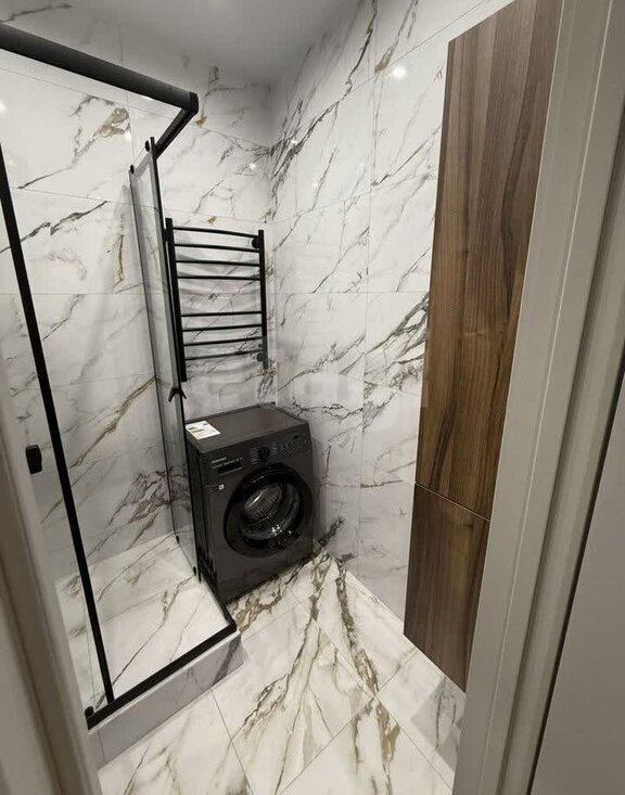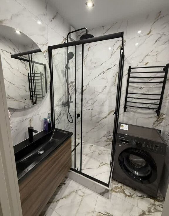 • Раздельный, с душевой кабиной, пеналом для хранения вещей, полотенцесушителем, зеркалом с подсветкой и раковиной с тумбой.