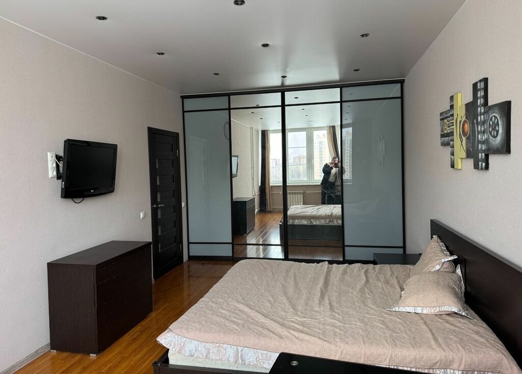 О квартире. Нормальный дизайнерский ремонт. В комнате 2х местная кровать, большая система хранения, телевизор, комод, компьютерный стол и кресло. В кухонной зоне: холодильник, плита, духовка, чайник, столовые приборы и посуда