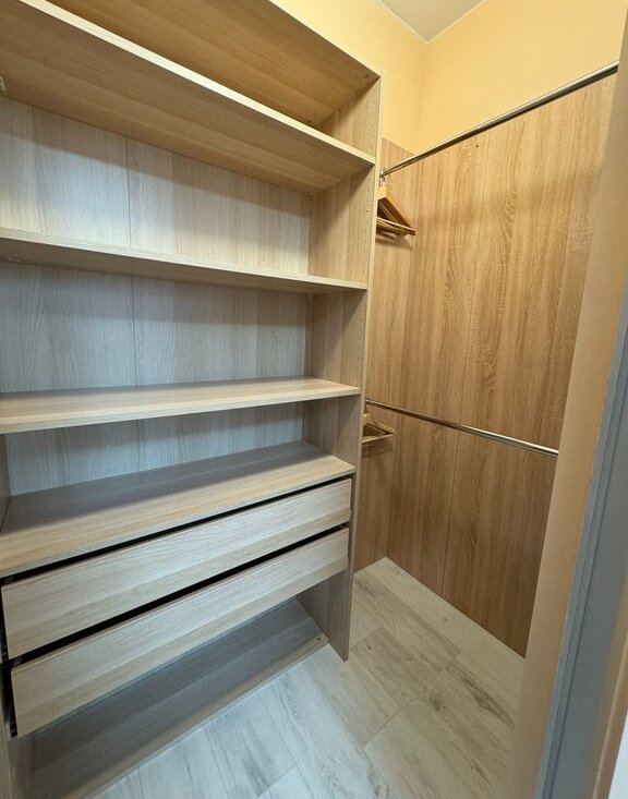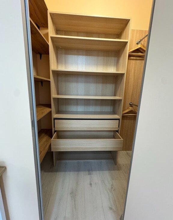 Практичная гардеробная и встроенные системы хранения освобождают пространство.