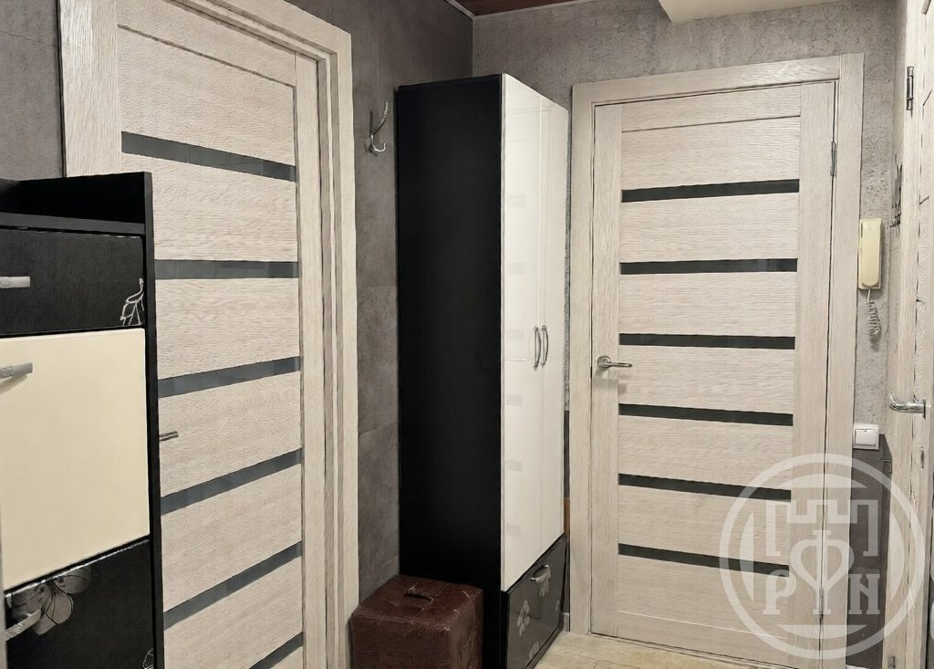 Квартира оснащена всем необходимым для проживания. В комнате расположился двухспальный диван, шкаф для личных вещей. Есть место для детской кровати.