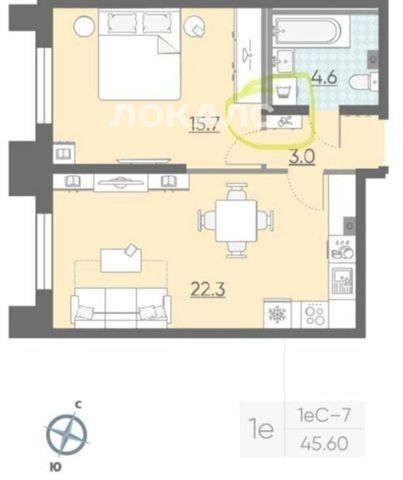 1-комнатная квартира: Санкт-Петербург, улица Дыбенко, 3 (45.6 м²)