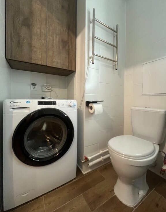 Ванная комната: ванная, стиральная машинка, декоративные полочки;