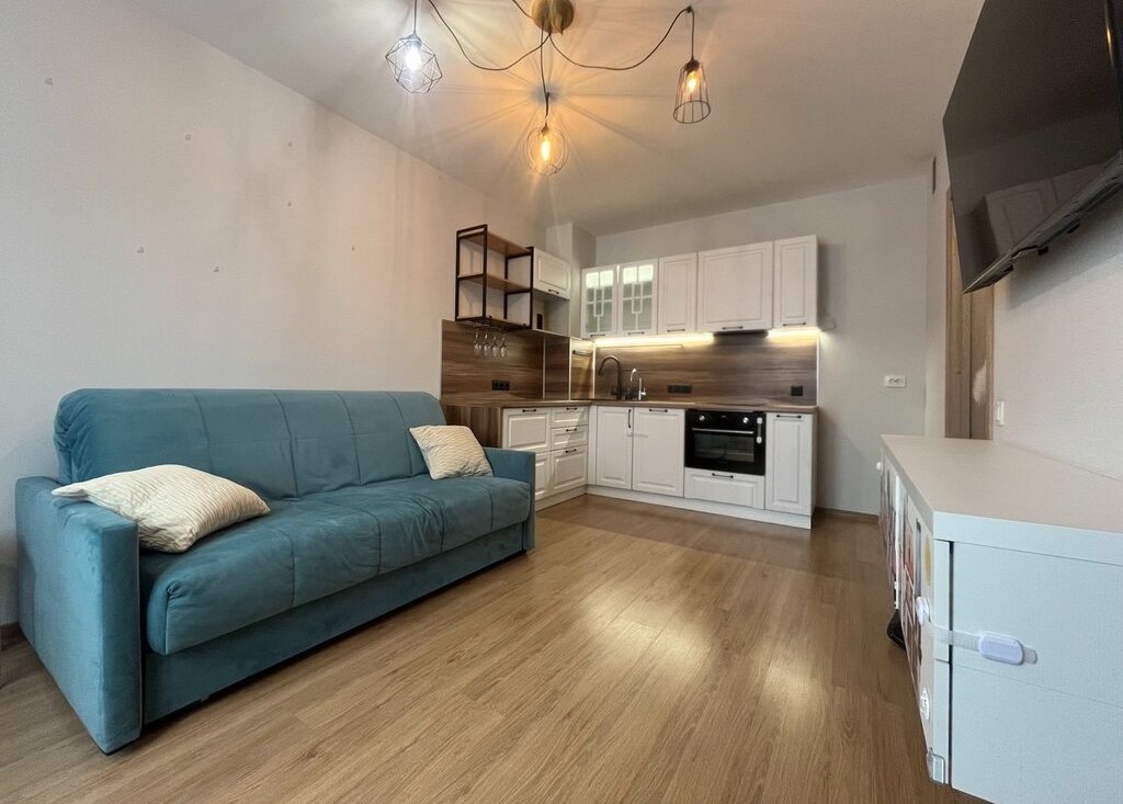 Кухня-гостиная: встроенная кухня, раскладной диван, телевизор со smart-tv, посудомойка, варочная панель, духовой шкаф, холодильник (на фото его нет, купили новый).