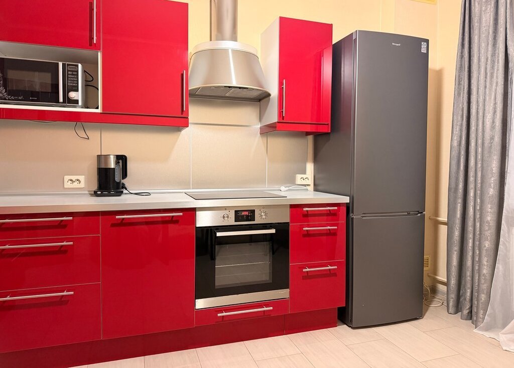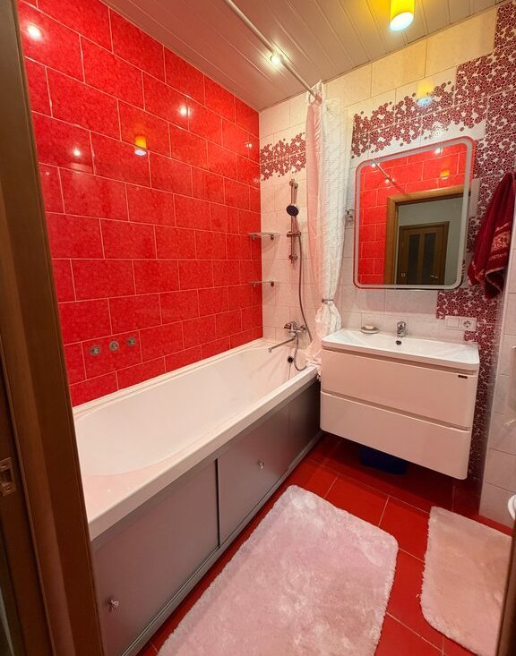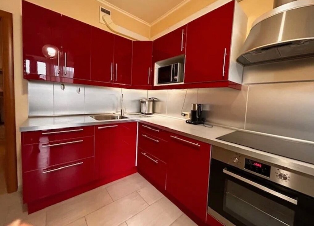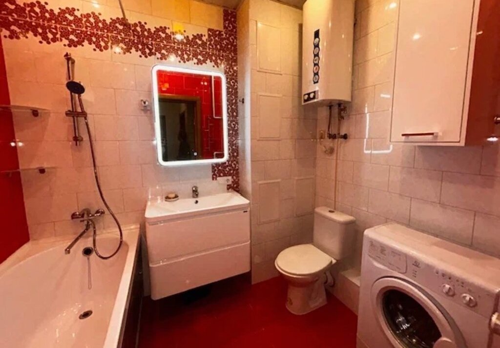 Сдается уютная квартира на длительный срок. Просторная комната с дизайнерским ремонтом, светлая и современная. Из мебели — вместительные шкафы и удобный диван. Кухня оборудована всей необходимой техникой: холодильник, плита, микроволновка и стиральная машина, посудомоечной машиной. Ванная комната оформлена в ярких красных тонах, установлена ванна.